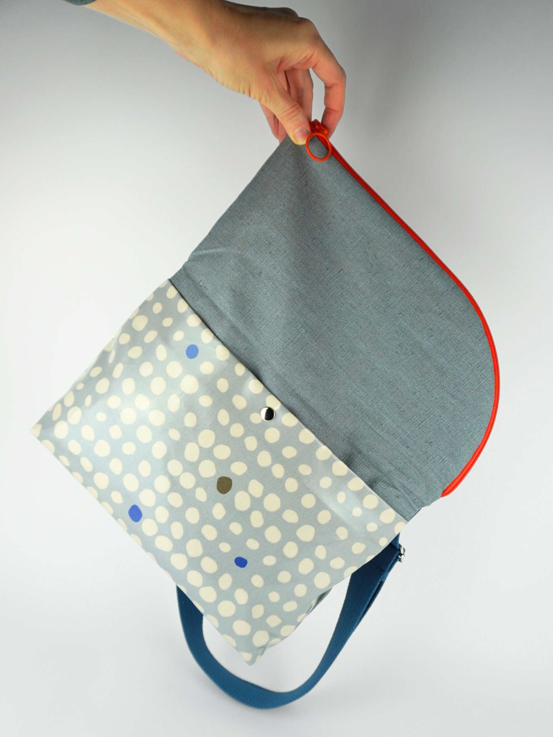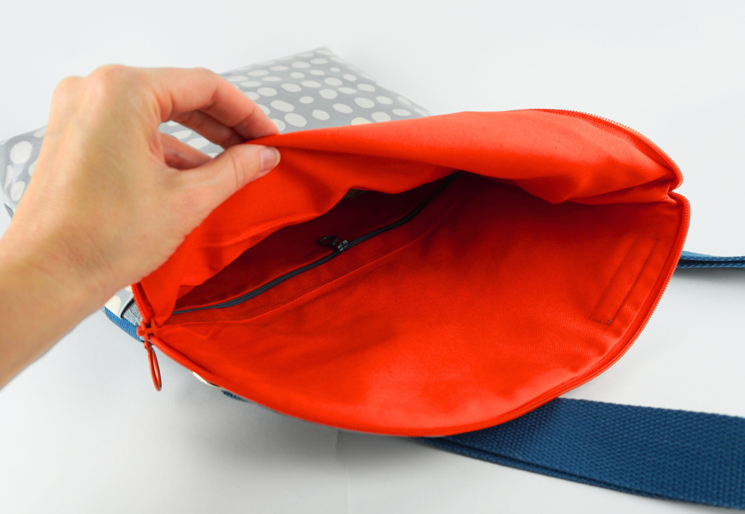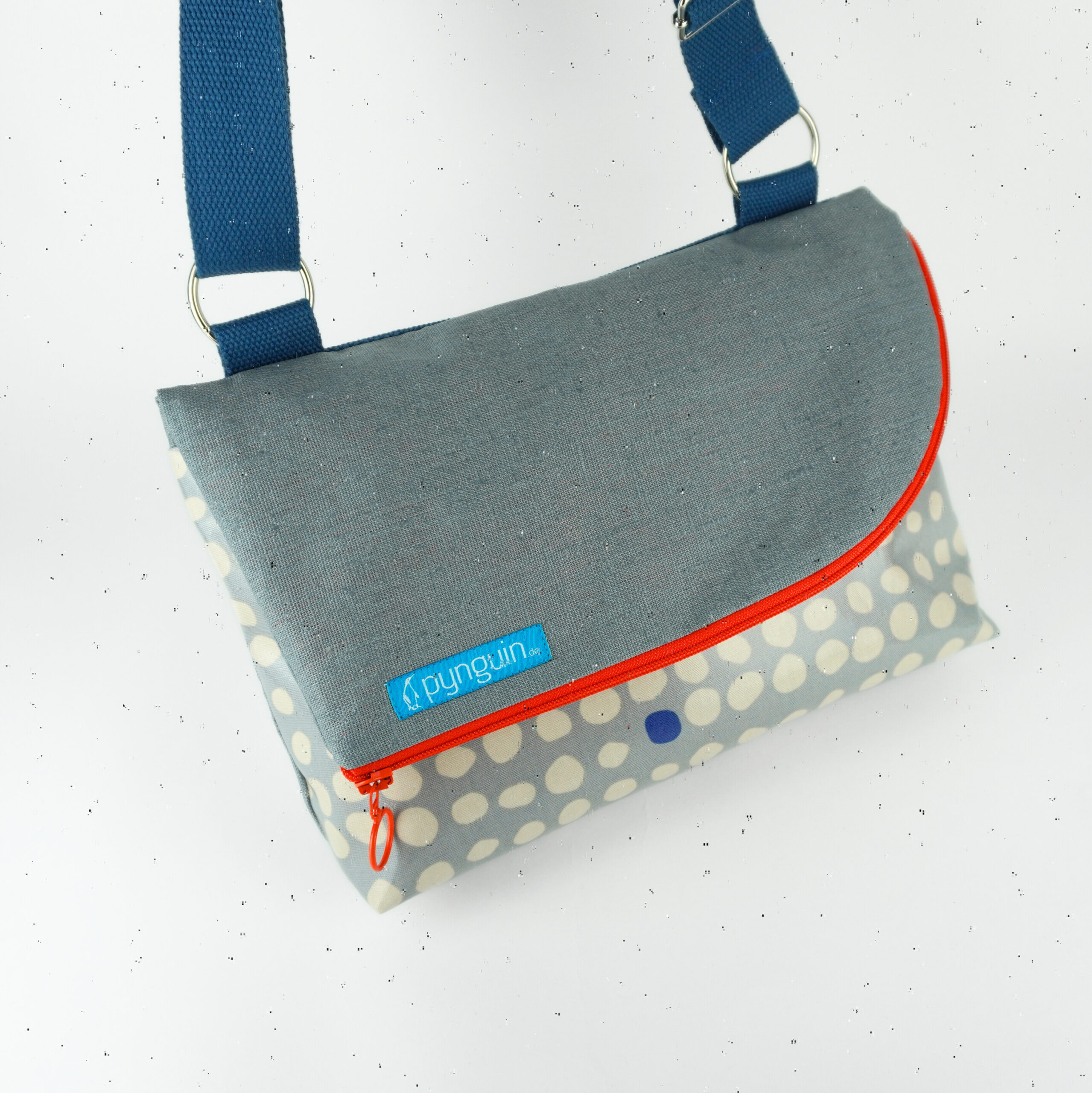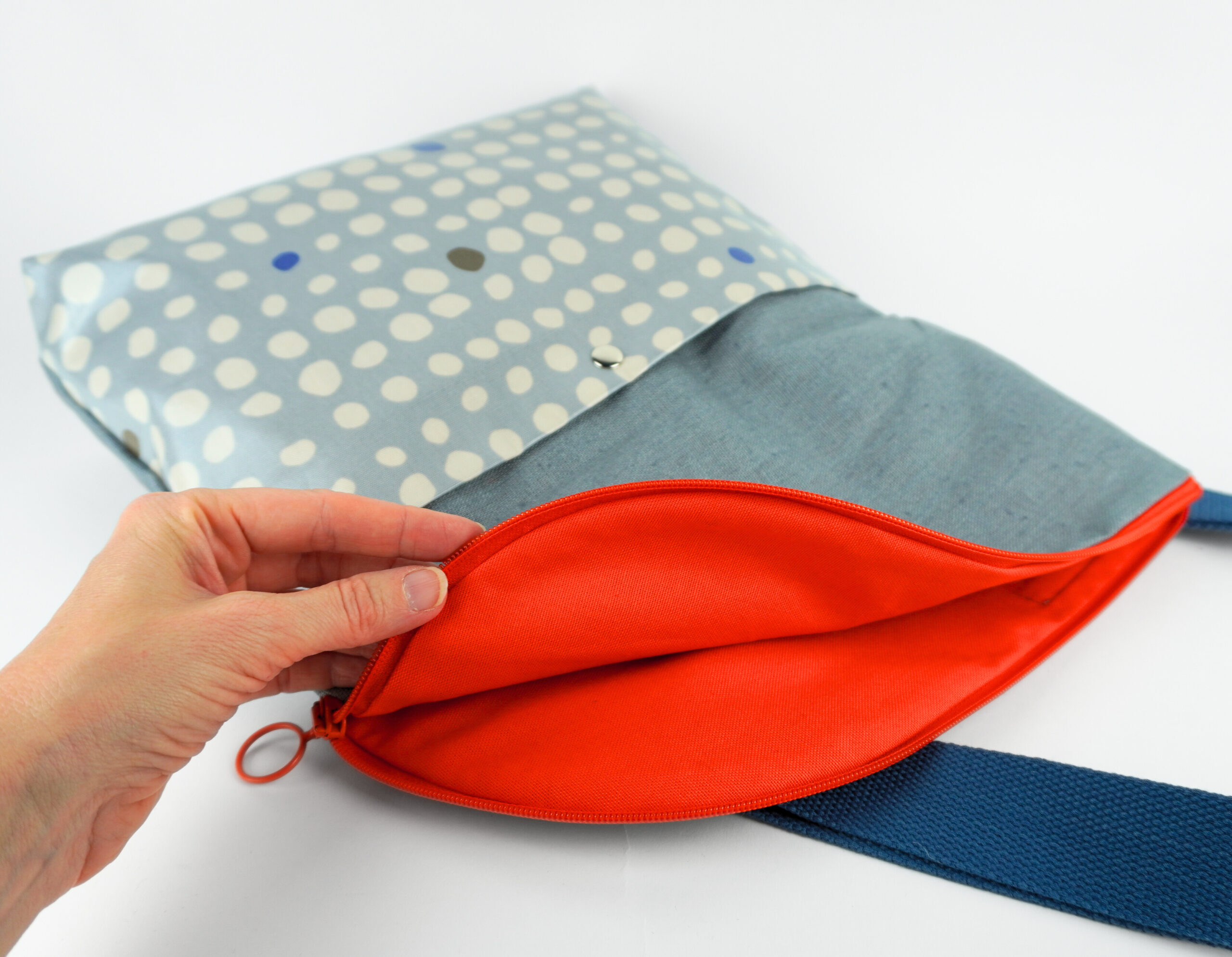 Diese Umhängtasche passt sich auch mal an. Wenn Du morgens nur mit Portemonnaie und Handy aus dem Haus gehst, ist die Klappe der Tasche unten und wenn Du auf dem Rückweg noch ein Brot und eine Gurke einkaufen möchtest, kannst Du einfach die Klappe der Tasche hochstehen lassen. So bietet die Tasche genügend Platz für einen kleinen Einkauf. Sie ist durch den runden Reißverschluss weit zu öffnen und man kommt gut an alle Sachen heran. Die Tasche ist mit einem Stoff von innen gegengefüttert. Es gibt eine Innentasche mit Reißverschluss. Ein weiteres Fach mit Druckknopf ist außen an der Tasche. Der Gurt ist verstellbar, so kann die Umhängtasche entweder einfach über die Schulter gehängt werden oder quer getragen werden.