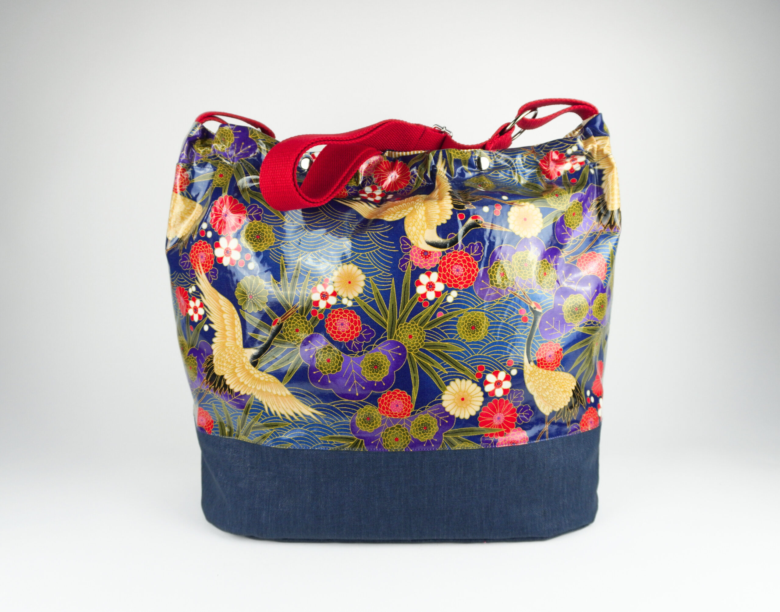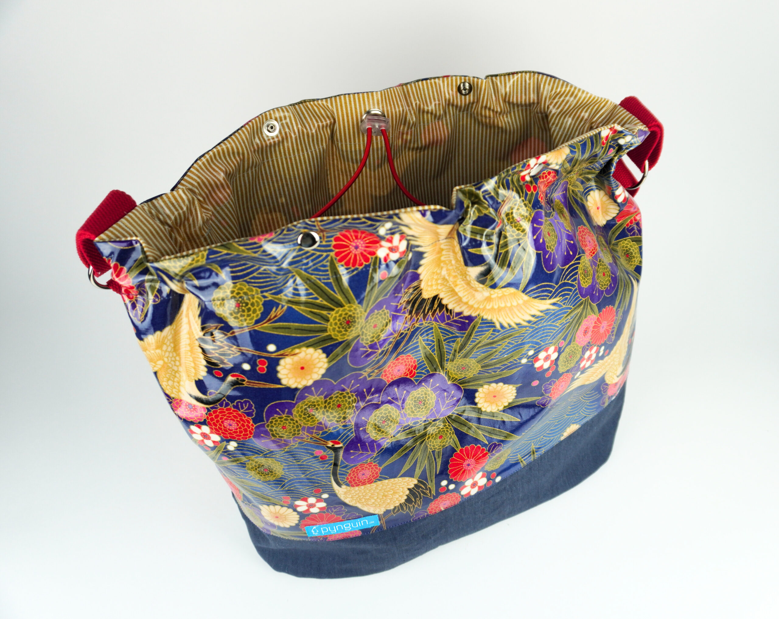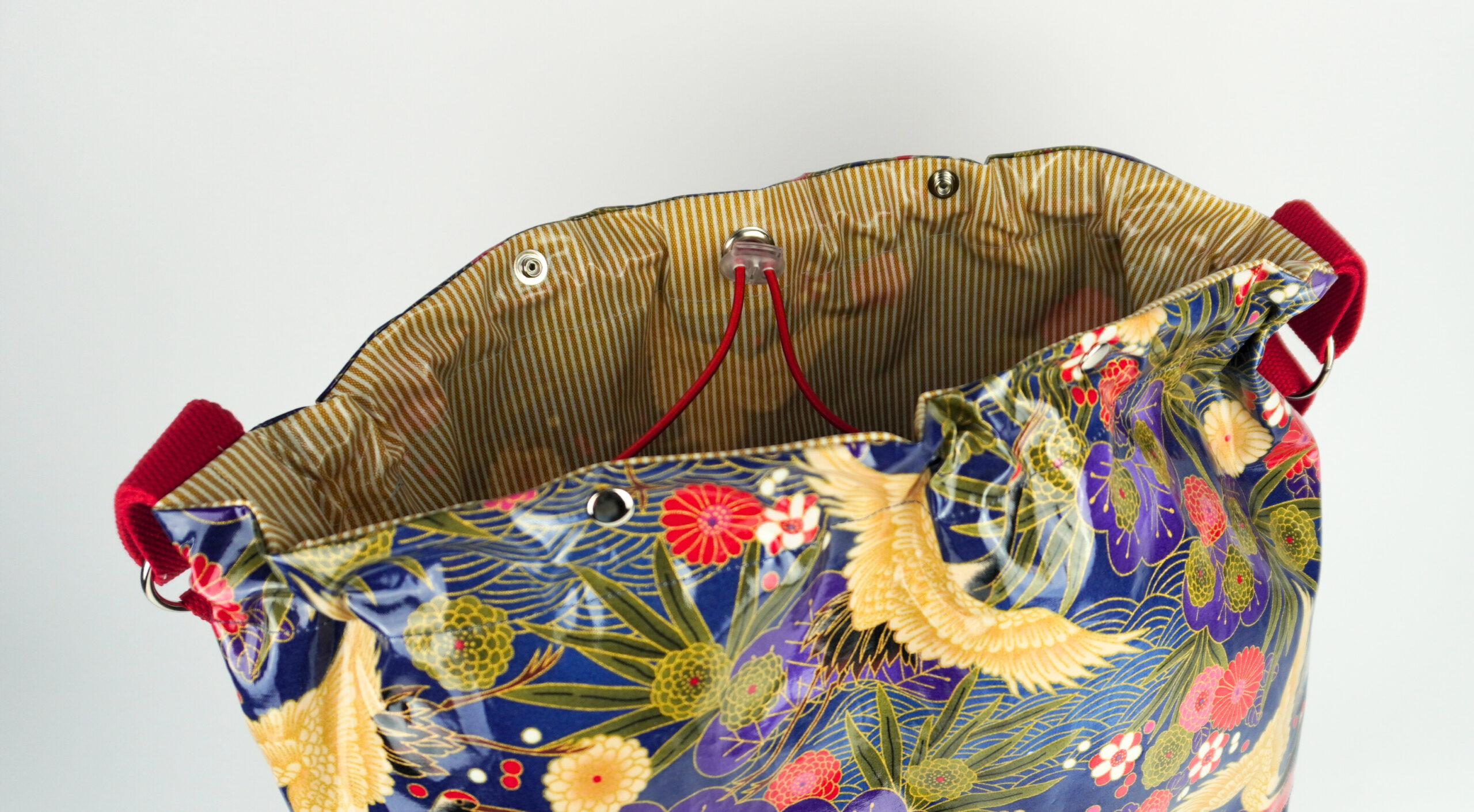 Innen wie Außen besteht der Shopper aus beschichteten Stoffen und lässt sich so gut ab-und-auswischen. Durch die Druckknöpfe kann der Shopper oben verschlossen werden und das Zugband mit dem Rundgummi kann die obere Öffnung verkleinern.