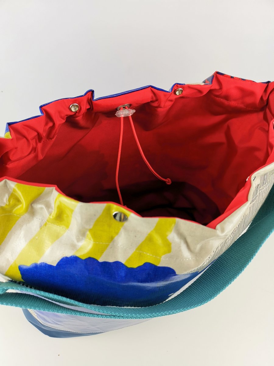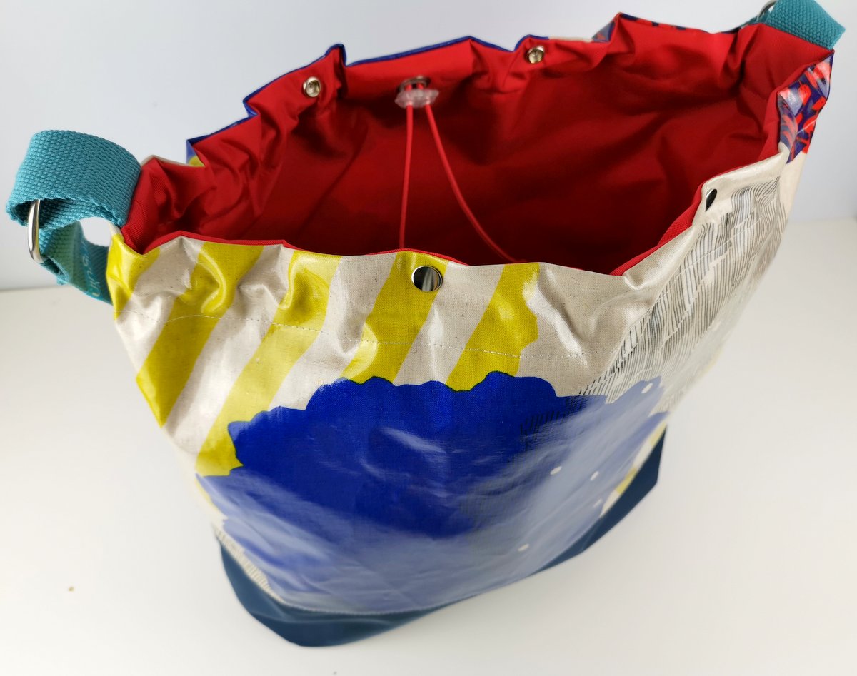 Innen wie Außen besteht der Shopper aus beschichteten Stoffen und lässt sich so gut ab-und-auswischen. Durch die Druckknöpfe kann der Shopper oben verschlossen werden und das Zugband mit dem Rundgummi kann die obere Öffnung verkleinern.
