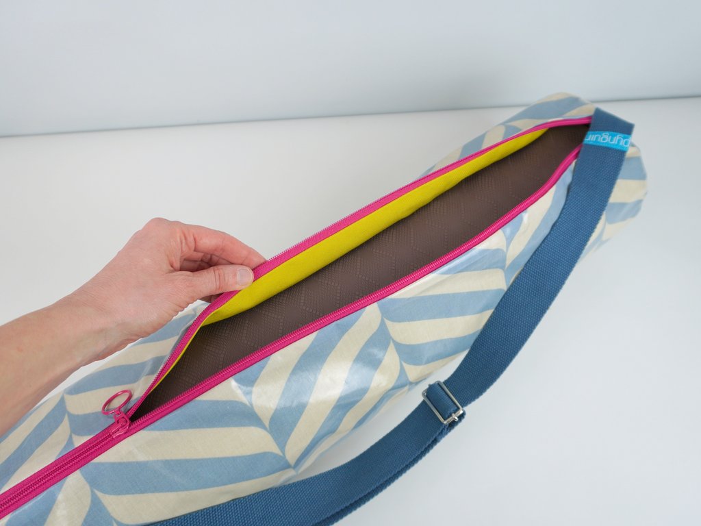 In die Yoga Tasche passt genau eine Yoga Matte und wenn Du möchtest sogar noch die mit eingerollte, weitere Auflage.